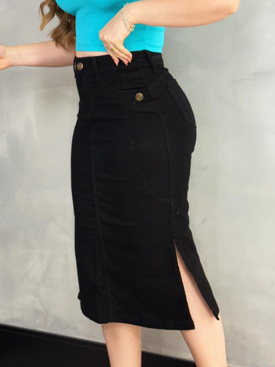 Saias Jeans Botão No Bolso Cintura Alta Moda Evangélica RetaSaias Jeans Botão No Bolso Cintura Alta Moda Evangélica Reta